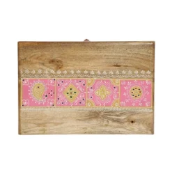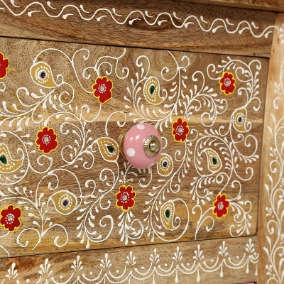 Looking for an accessory that was made with as much love and care as you have put into furnishing your home? With a durable mango wood frame and an exotic hand-painted design, our side table offers incredible structure and stunning looks for your interior space. This end table is the perfect companion to any living space with its ornate accents and two drawers for storage. Featuring an intricate oriental design, this side table adds sophisticated grace to any sofa or chair.